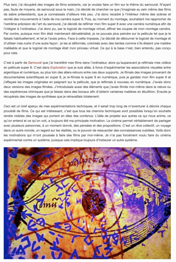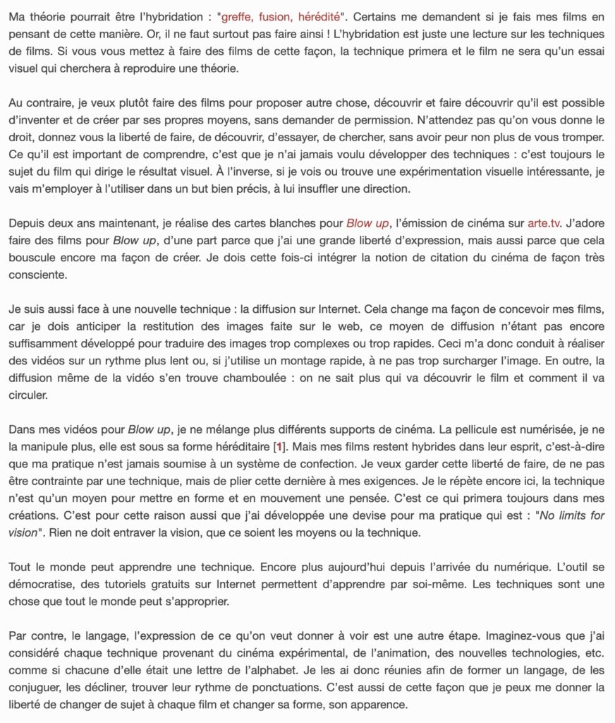 Extrait : « On a vite identifié mes films au genre « hybride », car j’utilisais différentes techniques du cinéma expérimental (peinture sur pellicule, montage caméra, image par image…), que j’ai très vite mélangées aux nouvelles technologies (images de synthèses, modélisation 3D, montage virtuel…). Ce processus n’a jamais été prémédité de ma part mais, travaillant avec très peu de moyens, j’ai utilisé toutes les possibilités pour mettre en images ce que je souhaitais donner à voir. Je voulais partager en images et en sons des visions personnelles qui me semblaient manquantes. Des idées, des propositions qui me semblaient en suspens. (…) »